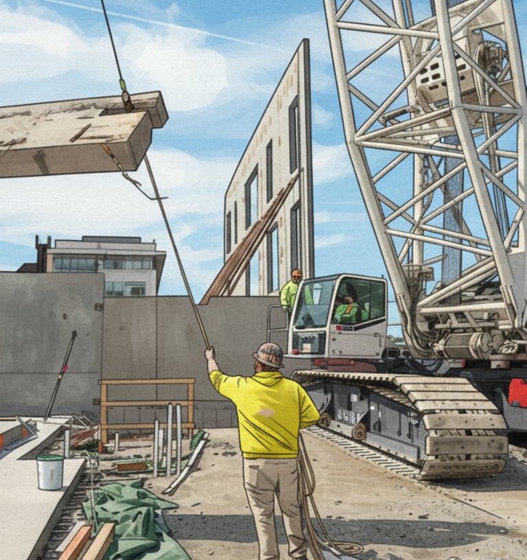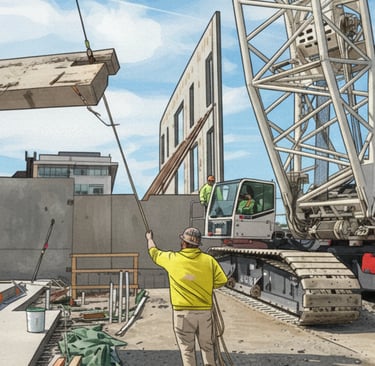 El Izaje: Una vez que los paneles han curado, una grúa de gran capacidad los levanta y los coloca en su posición vertical definitiva, donde se unen para formar la estructura exterior del edificio.